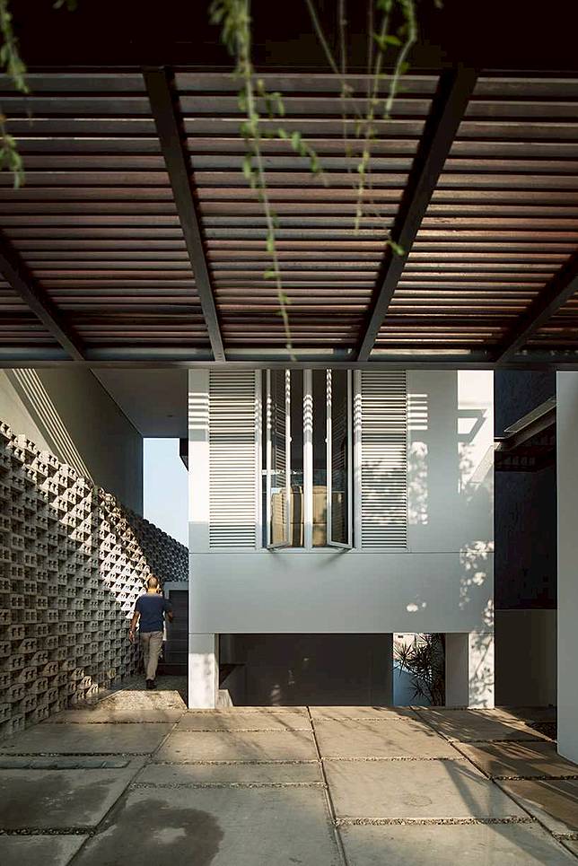Area paling depan adalah carport yang berbatasan langsung dengan halaman rumah tetangga. Rumah bergaya minimalist bila dipasang carport bernuasa country tentu tidak sejalan. Koridor itu menghubungkan area kamar anak dengan area servis di lantai 2.