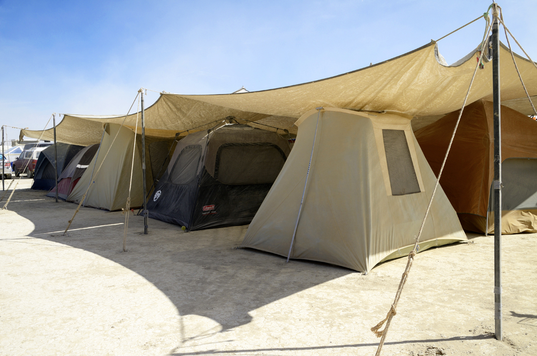 There are different types of tents for the burning man event. You also have to be careful about putting up sides on a canopy that dont let the wind through as they effectively turn into a sail. The best for simplicity and cost is the flat top steel shade structure.